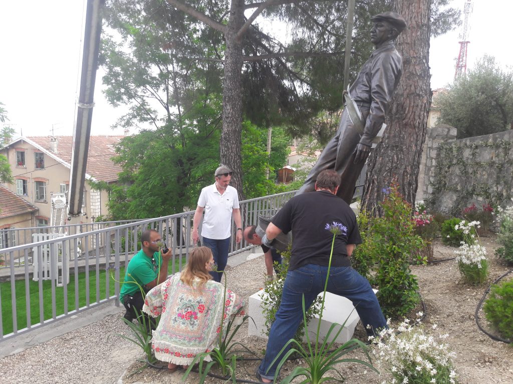 Le 30 mai Andrey Kovalchuk est arrivé à Grasse pour gérer l’installation de la Statue, ayant crée plusieurs œuvres monumentales (parmi d’autres une série de portraits sculpturaux d’écrivains russes), il sait bien que chaque détail compte pour mettre en valeur des créations artistiques que sont les statues et les monuments…